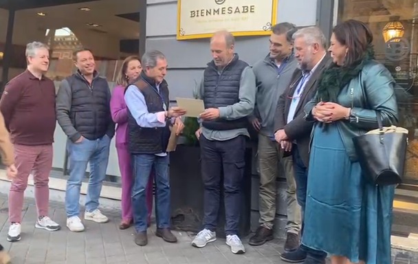 El pasado jueves día 25 de enero, una delegación de la junta directiva de la citada cofradía gastronómica, encabezada por el presidente de la misma, Pepe Oneto, Mila Bulpe, Consuelo Romero y Lolo Bernal, se desplazó hasta Madrid para comunicar a la propiedad de dichos restaurantes, que encabeza Oscar Rivera, dicha concesión, entregándole el escrito de mano del presidente de Los Esteros, donde se notificaba tal decisión, así como la imposición de la insignia de la Cofradía Gastronómica Isleña Los Esteros, que le fue impuesta por la responsable de actividades y animación, Consuelo Romero.