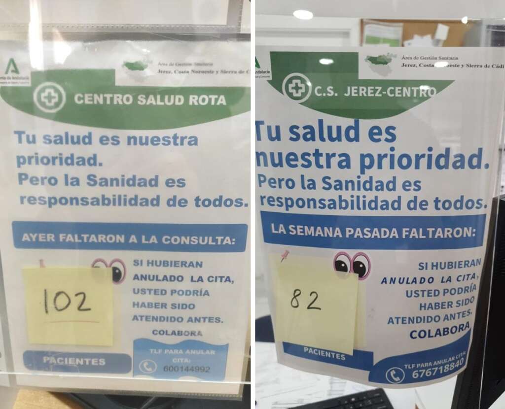 Desde este mes de enero el Área ha intensificado esta iniciativa con cartelería de la Consejería que informa del total de citas perdidas en Andalucía (2.785.393 de un total de las 38.980.085 solicitadas) y otra con la que el propio Centro de Salud ha perdido ese día. Además, todos los viernes desde los centros de Atención Primaria de Jerez, Costa Noroeste y Sierra se envía a la Dirección del Área las citas no anuladas esa semana; por ejemplo, la pasada semana, en el Centro de Salud de Rota no se anularon 461 citas y sólo el viernes 26 se perdieron un total de 102.