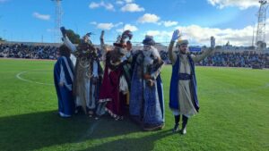Los monarcas de Oriente, además de la Estrella y el Heraldo Real dieron una vuelta al terreno de juego para saludar a todos los presentes. Niños y no tan niños celebraron la llegada de sus Reyes con mucho entusiasmo, con las miradas atónitas y llenas de sueños e ilusión pensando en "qué me traerán esta noche..."