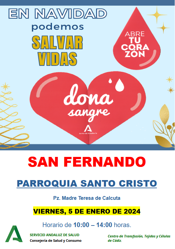 Una vez más desde CTTC de Cádiz piden a la población isleña que donen sangre y plasma, por lo que convocan una nuevas recolecta -en horario de mañana (de 10:00 a 14:00 horas)-, el próximo viernes 5 de enero de 2024 en la Parroquia Santo Cristo,-Plaza Madre Teresa de Calcuta-.