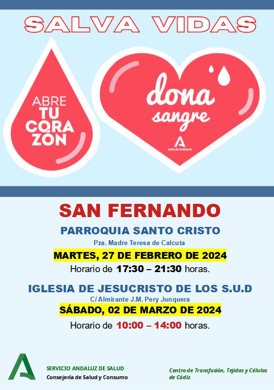 La Red Andaluza de Medicina Transfusional, Tejidos y Células de la Consejería de Salud y Familias una vez más hace un llamamiento urgente a los isleños para acudan a donar sangre y plasma con el fin de garantizar para cubrir las necesidades de los centros sanitarios de San Fernando.