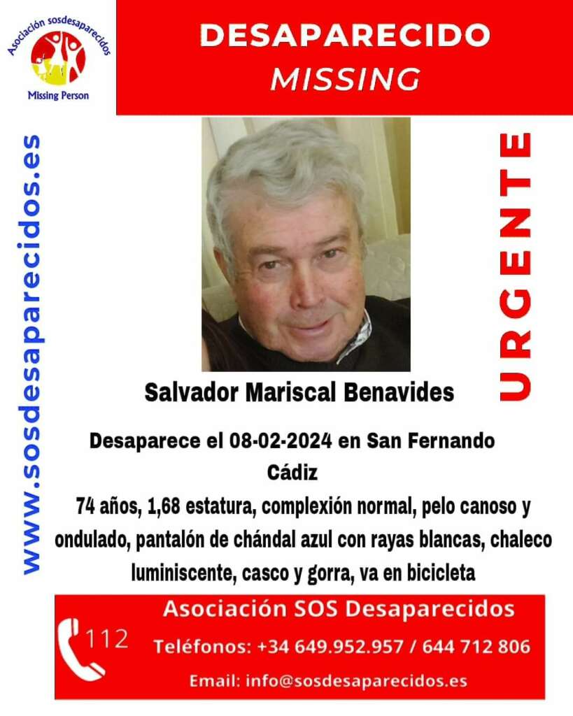 Desaparece en San Fernando Salvador Mariscal Benavide de 74 años, mide 1,68 de estatura, complexión normal, pelo castaño, ondulado y canoso, vestía pantalón de chándal azul con rayas blancas, portaba un chaleco luminescente, casco y gorra que circulaba en bicicleta.