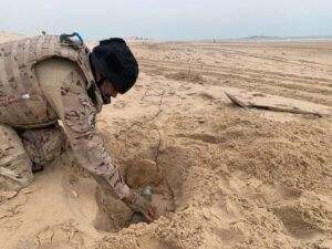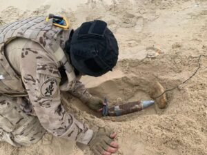 El Equipo de Desactivación de Explosivos de la Unidad de Buceo de Cádiz neutraliza un proyectil de 76mm, localizado en la playa de Camposoto, en San Fernando.