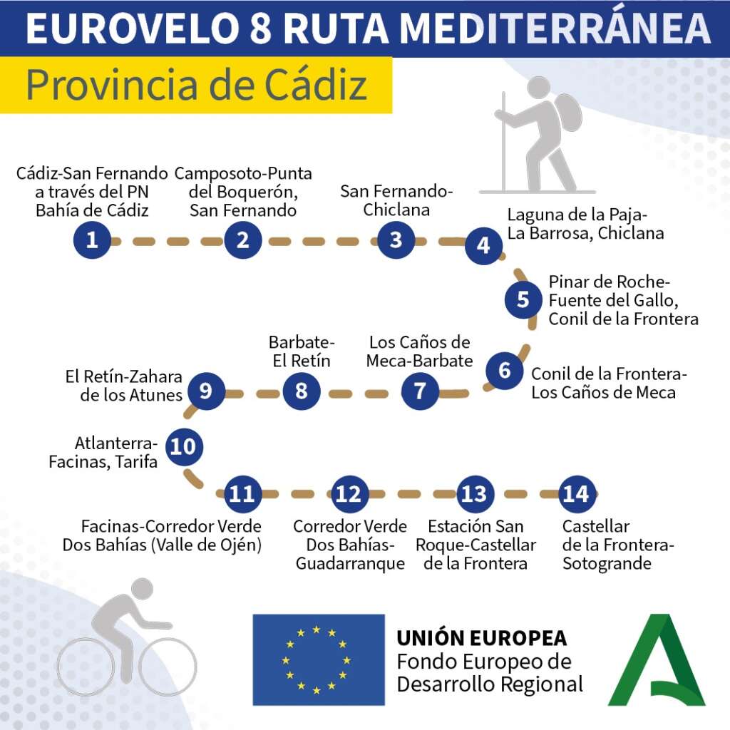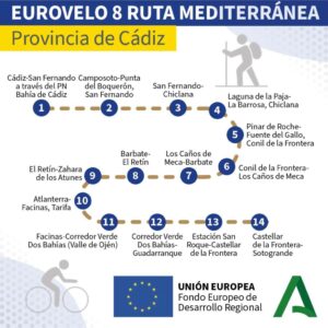 Asimismo, se ha referido a la Ruta del Estrecho, que permitirá conectar la Eurovelo 8 desde Zahara de los Atunes con el núcleo urbano de Tarifa y la Ruta del Río San Pedro, que unirá El Puerto de Sta. María con Puerto Real con un presupuesto de algo más de 1 millón. "En total una inversión global en las rutas gaditanas de más de 28 millones de euros".