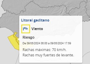 | 70 km/h | amarillo | Litoral gaditano,Cádiz | JUEVES 9 a las 06:00 | JUEVES 9 a las 17:59 | Rachas máximas: 70 km/h. Rachas muy fuertes de levante. | |