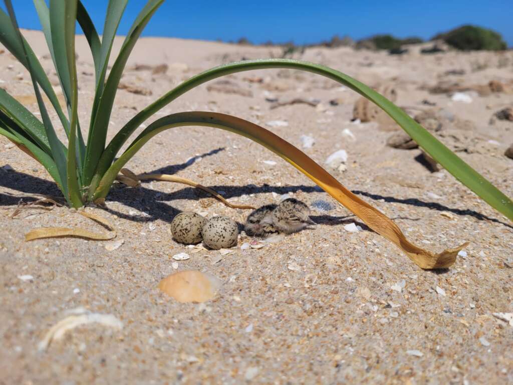 Los Servicios Centrales de Investigación de la UCA han comunicado al Parque Natural Bahía de Cádiz, a través unas fotografías hechas en la Punta del Boquerón, de cómo están eclosionando los pollitos de Chorlitejo patinegro esta temporada.