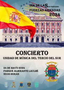 El día 24 de mayo, a las 20:00h, se celebrará en el Parque Almirante Laulhé de San Fernando, un concierto de la Unidad de Música del Tercio del Sur de Infantería de Marina.