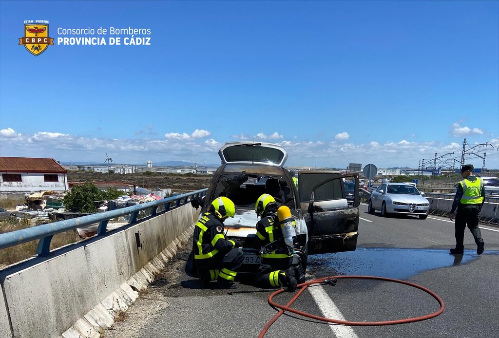Sofocan un incendio en un coche en el kilómetro 12 de la CA-33 sobre el puente sentido San Fernando