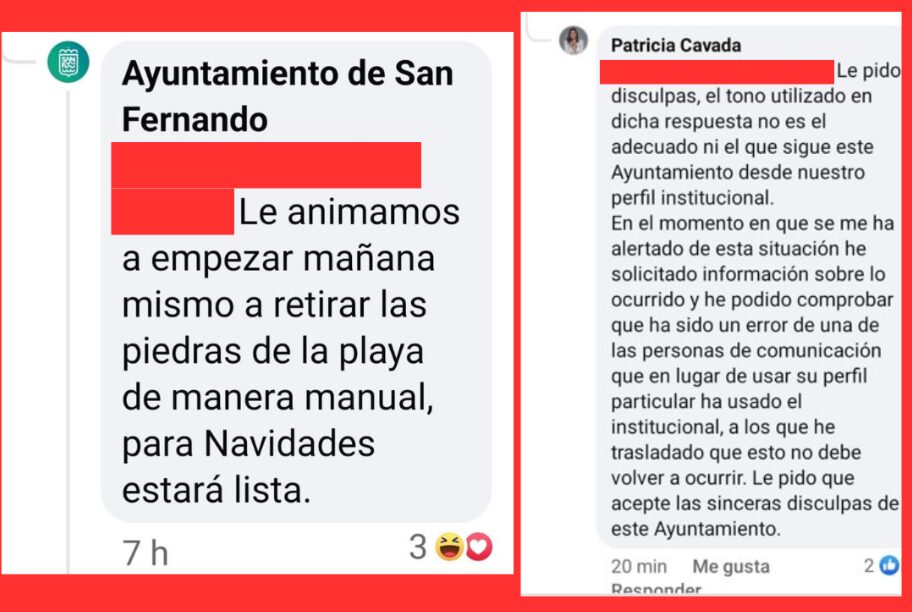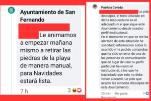 La concejala del Grupo Municipal AxSí Marta Vidal ha valorado el último y bochornoso ejemplo del uso partidista de las redes sociales municipales y de falta de respeto a los isleños por parte del gobierno municipal socialista. Este miércoles 19 de junio en la cuenta de Facebook del Ayuntamiento de San Fernando se contestaba a un ciudadano que se quejaba del estado de la Playa de Camposoto y de la proliferación de piedras en la misma de la siguiente manera: “Le animamos a empezar mañana mismo a retirar las piedras de la playa de manera manual, para Navidades estará lista”. “Quedamos perplejos ya no sólo por el tono empleado, la falta de respeto y muestra de inmadurez con la que se dirige a un ciudadano, utilizando la burla como respuesta en lugar de indicar en qué solución se trabaja”, explica Vidal.