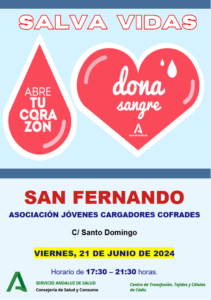 Una vez más desde CTTC de Cádiz piden a la población isleña que donen sangre y plasma, por lo que convocan una nuevas recolecta -en horario de tarde (de 17:30 a 21:30 horas)-, el próximo viernes 21 de junio de 2024 en la calle Santo Domingo en la Asociación Jóvenes Cargadores Cofrades de San Fernando.