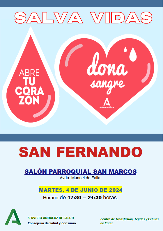 La Red Andaluza de Medicina Transfusional, Tejidos y Células de la Consejería de Salud y Familias una vez más hace un llamamiento urgente a los isleños para acudan a donar sangre y plasma con el fin de garantizar para cubrir las necesidades de los centros sanitarios de San Fernando.