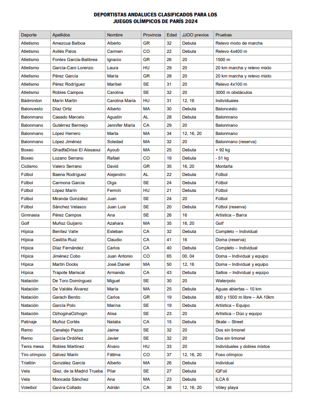 El deporte andaluz estará representado por 19 mujeres y 24 hombres en los Juegos de la XXXIII Olimpiada