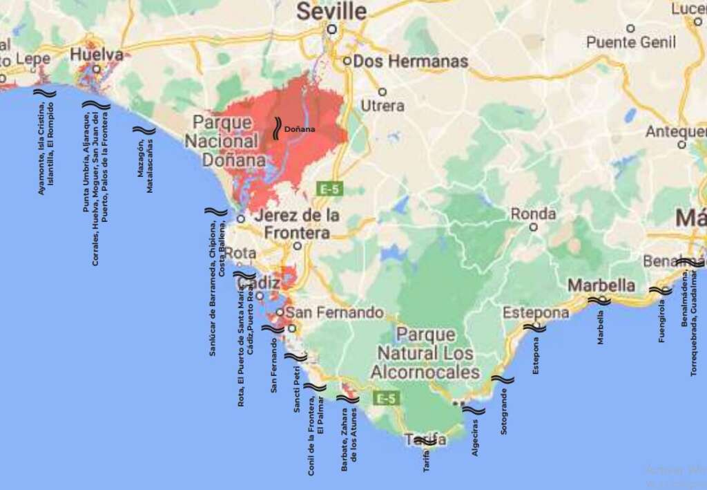 Greenpeace ha realizado un estudio por comunidades autónomas haciendo especial hincapié en las costas gaditanas al estar amenazadas por la subida del nivel del mar en 2030, entre las que se encuentra la Playa de Camposoto de San Fernando además de las de Sanlúcar de Barrameda, Chipiona, Costa Ballena, Rota, El Puerto de Santa María, Cádiz, Puerto Real, Sancti Petri, Conil de la Frontera, El Palmar, Barbate, Zahara de los Atunes, Tarifa, Algeciras y Sotogrande.