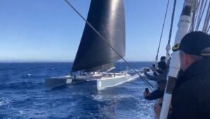 Elcano se cruza con el velero Maxicat Victoria de Alex Pella que intenta hacer el récord de la vuelta a España