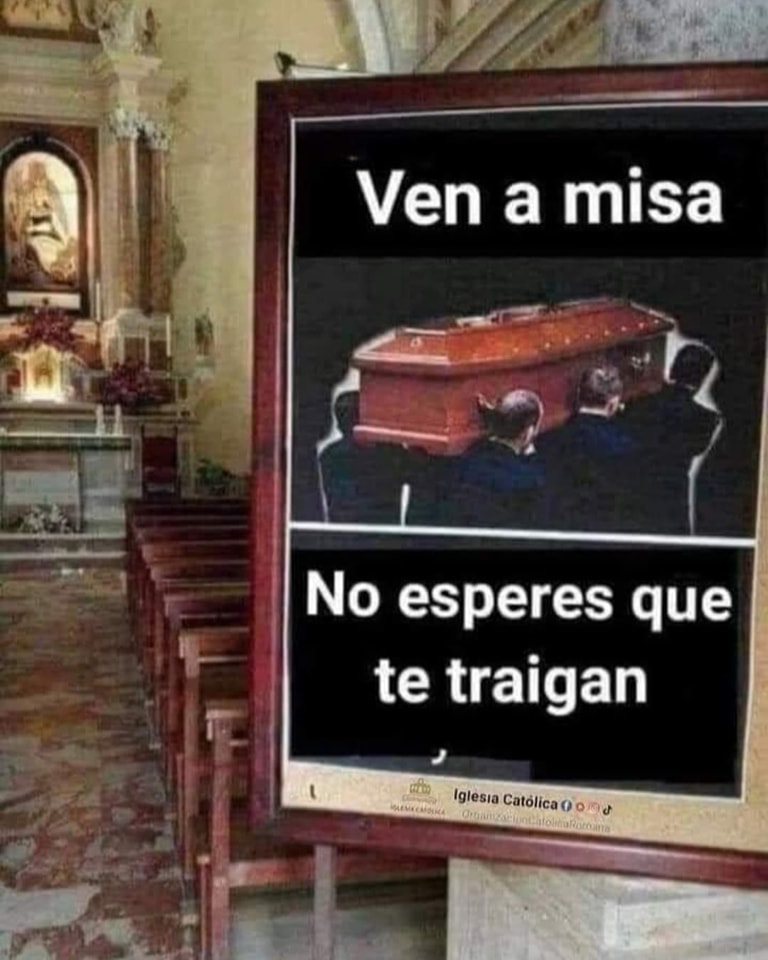 Se trata de un fotografía de varias personas portando un ataúd junto a esta frase: "Ven a misa, no esperes a que te traigan"