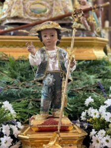 El Divino Pastor estrena para este 15 de agosto un terno compuesto de chaleco y pantalón, confeccionado en espolín color verde agua en el que se tejen flores con sedas de colores, con hilo de oro y plata, ribeteado el conjunto con un encaje también en hilo de oro. Un tejido espolinado que produce un único y característico efecto de bordado.