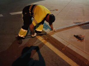 En la madrugada del 22 al 23 de agosto operarios de la comunidad de propietarios pusieron en pie una de las señales más importantes como es la señalización de una rotonda. Decisión que una vez más se vieron obligados a tomar al transcurrir más de tres días y con vistas al fin de semana por el aumento de la circulación de vehículos y peatones.