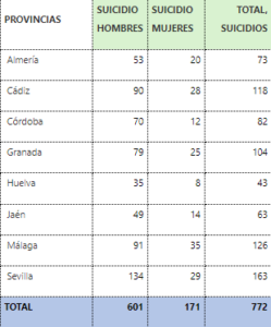 La diferencia en la distribución de muertes por suicidio según el sexo también subraya la necesidad de un enfoque más inclusivo y específico. En 2023, de las 772 personas que se suicidaron en Andalucía, 601 eran hombres y 171 eran mujeres. Eso es el 77,85% de hombres y 22,15% de mujeres. Un 2,5% más que el resto de España cuyo porcentaje es 75, 20% hombres.