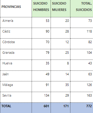 Andalucía registró 772 suicidios, lo que representa una tasa de 0,9 por cada 10.000 habitantes. A pesar de un descenso en el número total, las diferencias entre provincias son notables. Mientras Granada, Málaga y Huelva muestra una mejora, otras provincias como Almería, Córdoba y Cádiz han visto un aumento en los casos.