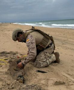Este sábado siete de septiembre rl Equipo de Desactivado de Explosivos de la Unidad de Buceo de Cádiz ha neutralizando una granada mortero localizada en la playa de Camposoto de San Fernando.