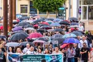 La concentración organizada y encabezada por la familia del isleño asesinado en acto de servicio, Miguel Ángel, portaba una pancarta que indicaba 'Justicia para Miguel Ángel y David-Asesinato intencionado-Prisión permanente revisable'. De igual manera la bandera de la Guardia Civil estuvo también presente.