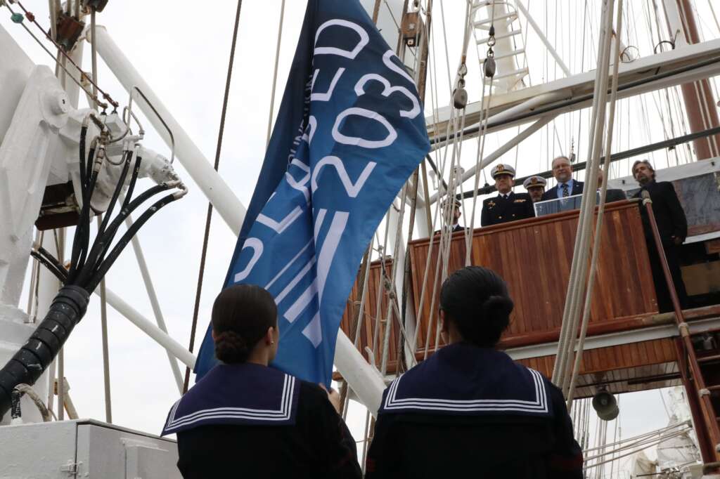 Este miércoles 16 de octubre se ha izado a bordo del buque-escuela «Juan Sebastián de Elcano» la bandera del proyecto Seabed 2030 de Naciones Unidas.