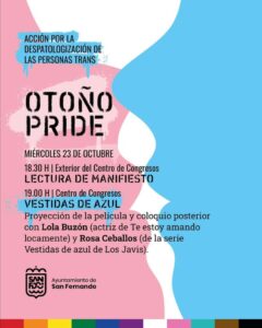 En primer lugar a las 18:30 horas tendrá lugar la lectura del manifiesto a las puertas del Centro de Congresos de San Fernando para luego pasar al interior alrededor de las siete de la tarde para ver la proyección de la película 'Vestidas de azul' finalizando la primera jornada de 'Otoño Pride' con un coloquio teniendo como invitadas a Lola Buzón, actriz gaditana y trianera conocida que interpretar a 'La Paca' en la película 'Te estoy amando locamente'; y a Rosa Ceballos, también actriz de la serie 'Vestidas de azul' de Los Javis.