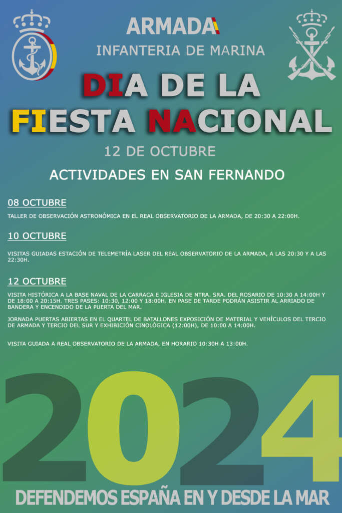 La Armada tiene previsto realizar con motivo del Día de la Fiesta Nacional varios actos en sus distintas bases navales y acuartelamientos. Estos incluirán jornadas de puertas abiertas, visitas, exposiciones y exhibiciones. Los que se realizarán en la ciudad de San Fernando serán los siguientes: