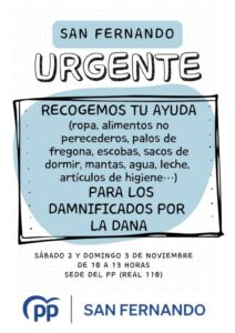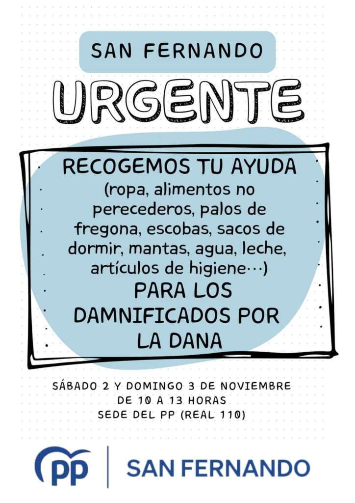 La recogida de donaciones se realizará en la sede del Partido Popular de San Fernando, ubicada en la calle Real 191, durante este fin de semana, el sábado y domingo 2 y 3 de noviembre, en horario de 10:00 de la mañana a 13:00 de la tarde.