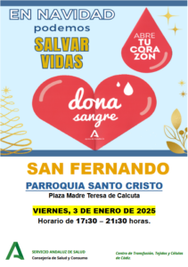 Una vez más desde CTTC de Cádiz piden a la población isleña que donen sangre y plasma, por lo que convocan una nuevas recolecta -en horario de mañana (de 17:30 a 21:30 horas)-, el próximo viernes 3 de enero de 2024 en la Parroquia Santo Cristo,-Plaza Madre Teresa de Calcuta-.
