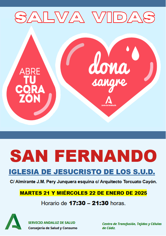 La Red Andaluza de Medicina Transfusional, Tejidos y Células de la Consejería de Salud y Familias una vez más hace un llamamiento urgente a los isleños para acudan a donar sangre y plasma con el fin de garantizar para cubrir las necesidades de los centros sanitarios de San Fernando.