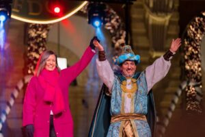 Al filo de las ocho de la tarde, el Heraldo llegó al Castillo de San Romualdo donde le esperaba la alcaldesa, Patricia Cavada, para concederle la venía con la que se autoriza la llegada de Sus Majestades los Reyes de Oriente a San Fernando. Y, para ello, la primera edil le hizo entrega de las llaves de la ciudad.
