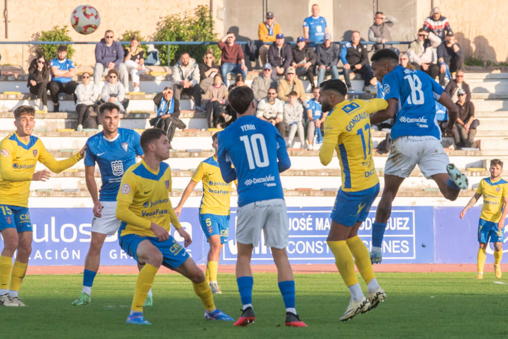Comenzó el San Fernando bien plantado dejando en los primeros compases el balón al Orihuela. Fue Dani García, en el 8’, el que tuvo la primera ocasión para los isleños con un remate mordido a la salida del córner. Poco después, otro cabezazo, esta vez de Manny estuvo a punto de significar el primero del partido (10’) pero el esférico se fue fuera por poco.