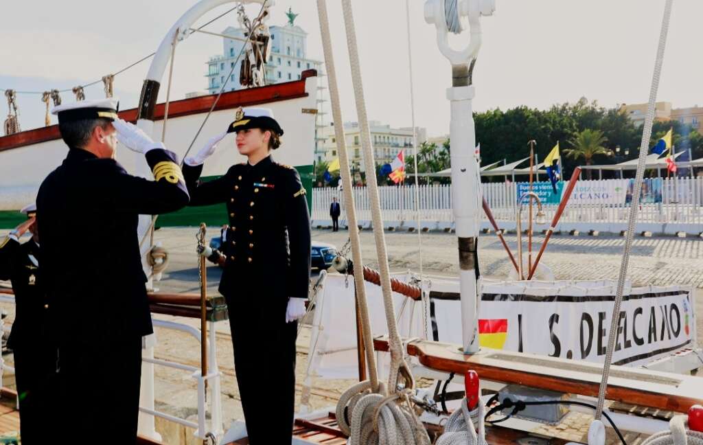Doña Leonor se incorporó al Buque Escuela 'Juan Sebastián de Elcano' en un acto celebrado en el puerto de Cádiz, marcando el inicio de su formación como guardiamarina de primero. A su llegada al Buque, fue recibida en la meseta del portalón por el Capitán de Navío Comandante del Buque, Luis Carreras-Presas do Campo, y acompañada por el Capitán de Fragata Segundo Comandante, Carlos Carrasco Marín