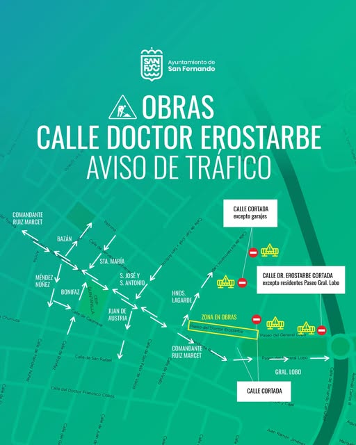 El Ayuntamiento de San Fernando ha informado del inicio de las obras de renovación integral de las redes de saneamiento y abastecimiento de la calle Doctor Erostarbe y parte del paseo General Lobo, que se llevarán a cabo con un presupuesto de 173.646,39 euros (más IVA) y un plazo de ejecución de tres meses. Los trabajos provocarán cortes de tráfico programados y una modificación del itinerario de los autobuses de la línea 2 (Gallineras-Camposoto-Barriada de Bazán) y del interurbano M-010 (Cádiz-San Fernando Norte).