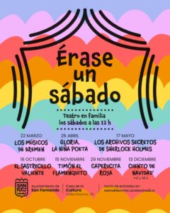 El Ayuntamiento de San Fernando ha presentado hoy un nuevo ciclo de espectáculos infantiles de corte familiar que, bajo el título ‘Érase un sábado’, pondrá en marcha a partir del próximo 22 de marzo. Serán siete citas mensuales hasta final de año en la Casa de la Cultura.