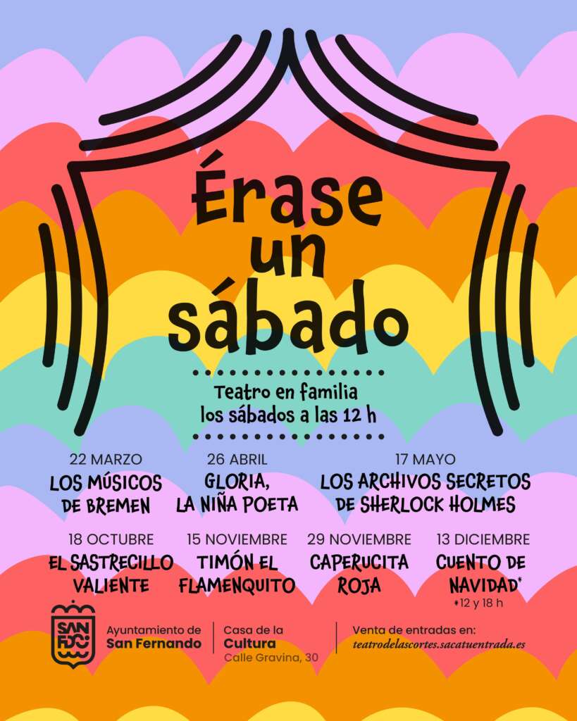 Los espectáculos y las fechas serán ‘Los músicos de Bremen’, el 22 de marzo a las 12.00 horas; ‘Gloria, la niña poeta’, el 26 de abril a las 12.00 horas; ‘Los archivos secretos de Sherlock Holmes’, el 17 de mayo a las 12.00 horas; ‘El sastrecillo valiente’, el 18 de octubre a las 12.00 horas; ‘Timón el flamenquito’, el 15 de noviembre el 12.00 horas; ‘Caperucita roja’, el 29 de noviembre a las 12.00 horas; y ‘Cuento de Navidad’, en sesión doble, a las 12.00 y las 18.00 horas, el 13 de diciembre.