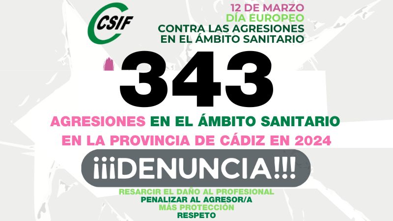 CSIF ha criticado los incumplimientos de la Junta de Andalucía sobre la puesta en marcha de medidas para erradicar las agresiones al personal de la sanidad pública, pese al lamentable incremento de los episodios de violencia física y verbal hacia estos profesionales. En 2024 se registraron 1.866 agresiones al personal del SAS, lo que supone un 19,3 por ciento más respecto a las 1.564 que se denunciaron el año anterior (en la provincia de Cádiz se registraron 343 en 2024 (199 en 2023), siendo la segunda en Andalucía, por detrás solo de Sevilla).