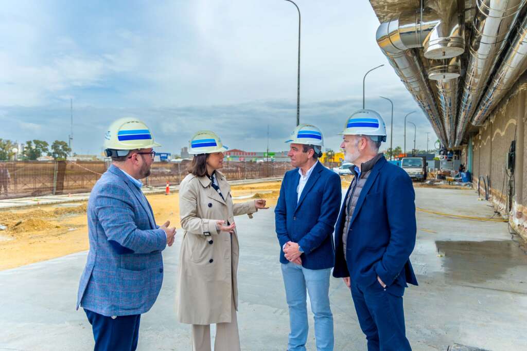 La alcaldesa, Patricia Cavada, y el director de operaciones de Castellana Propierties, Julio García, junto al director del Centro Comercial Bahía Sur, Pablo Vivancos, han comprobado este jueves el avance de las obras de este nuevo paseo gastronómico, que abrirá al público en junio tras una inversión que ronda los 3,5 millones de euros.