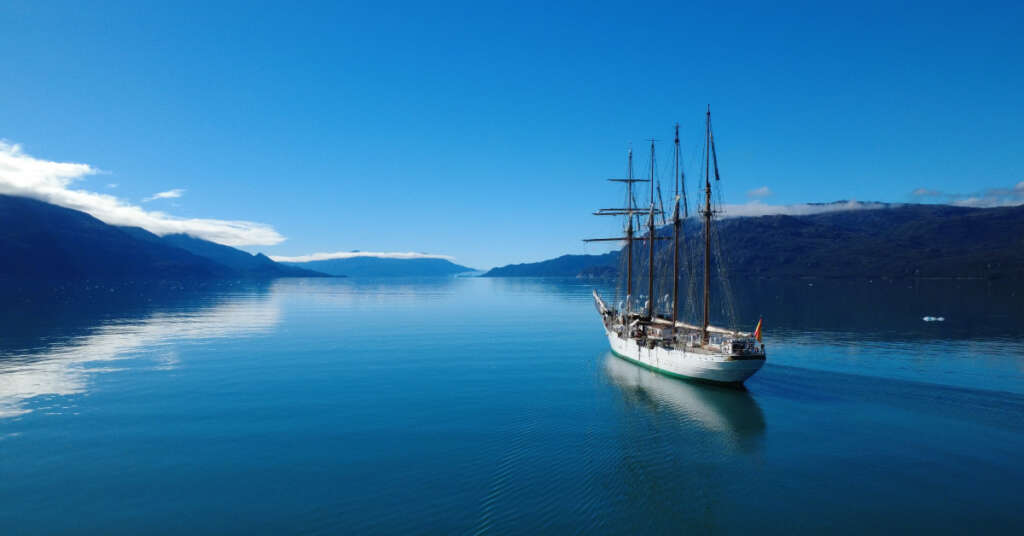 Elcano deja una bellísima estampa en los canales patagónicos con su navegación imponente