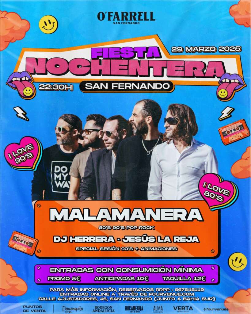 La Sala O’Farrell, ubicada en calle Ajustadores 10, en el Polígono Fadricas de San Fernando, -junto a Bahía Sur-, ofrece el próximo sábado 29 de marzo, y a partir de las 22:00 horas una nueva fiesta dedicada a la música de los 80's y 90's, o lo que es lo mismo, una fiesta con diversión y música de toda la vida además de contar con la actuación en directo del conocido grupo de Tarifa 'Malamanera'.