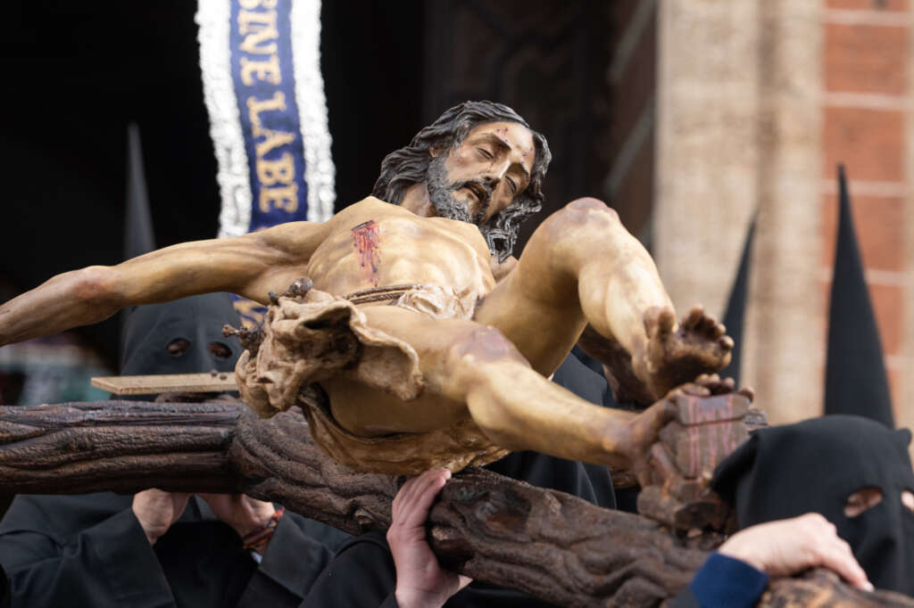 Desde la Iglesia Mayor, la Venerable Orden Tercera de Servitas inició su recorrido con 45 minutos de retraso respecto a su hora prevista, como ya se había anunciado. El templete de la Orden Seglar de María, con varios estrenos en su paso procesional, avanzaba con decisión a pesar de los pronósticos meteorológicos. Como cada año, el paso por la calle La Vega resultó especialmente destacado, ocupando el ancho completo de la vía con el sobrio y solemne andar que caracteriza a esta cofradía. Así concluyó su estación de penitencia, fiel a su estilo austero y recogido.