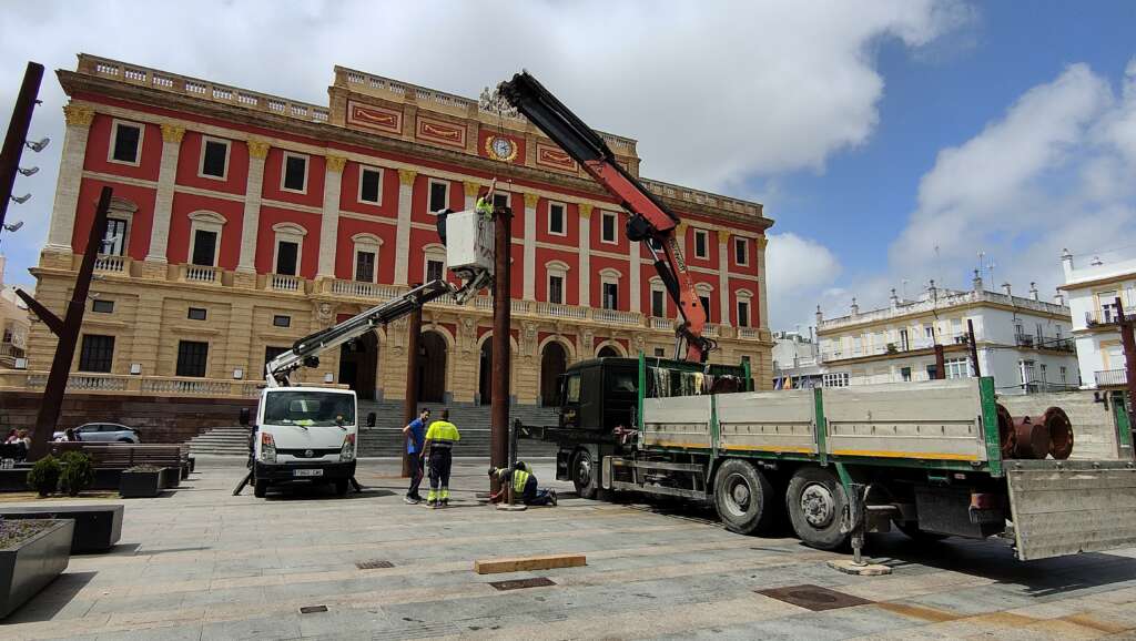 Vuelven a colocar los báculos que soportarán los toldos de la Plaza del Rey tras la finalización de la Semana Santa en San Fernando