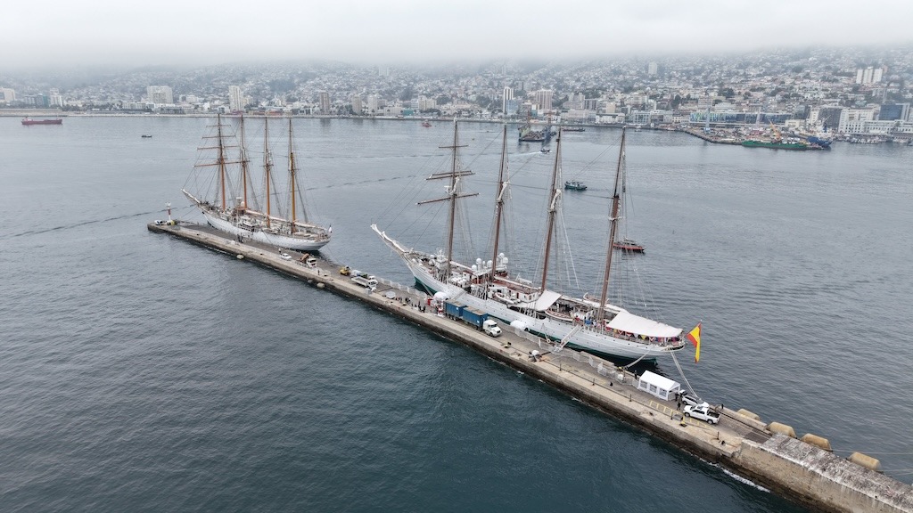 Los emblemáticos buques escuela 'Esmeralda' de la Armada de Chile y 'Juan Sebastián de Elcano' de la Armada Española se reencontraron en el puerto de Valparaíso, evento que no ocurría desde la conmemoración de los 500 años del Estrecho de Magallanes en octubre de 2020, realizada en Punta Arenas.