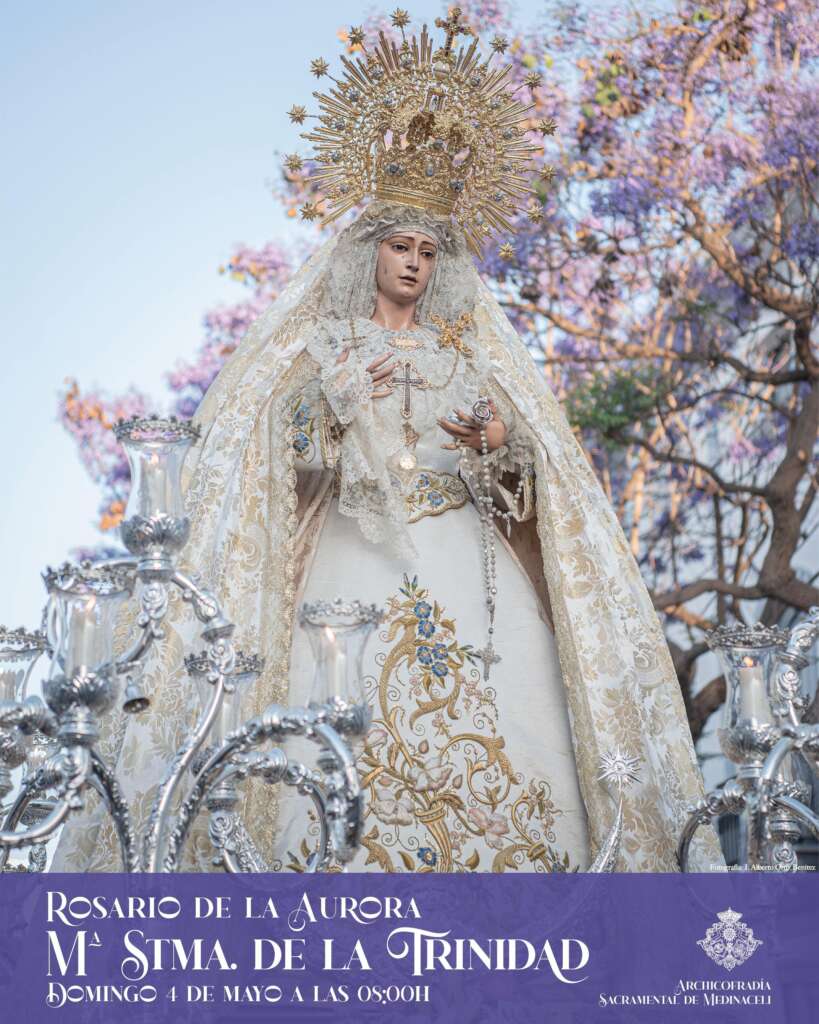 A las 8:00 horas tendrá lugar el solemne Rosario de la Aurora con la Imagen de María Santísima de la Trinidad, desde la Iglesia Mayor Parroquial de San Pedro y San Pablo. Este acto devocional está organizado por la Archicofradía Sacramental de Medinaceli, como es habitual cada primer domingo de mayo, mes especialmente dedicado a la Virgen María.