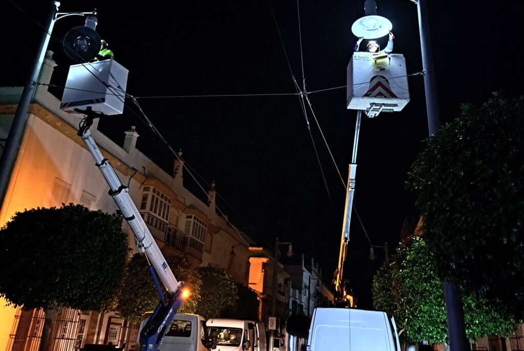 Los trabajos de sustitución de luminarias han comenzado en el extremo sur de la calle Real de San Fernando y avanzan hacia la Venta de Vargas y, a la vez, hacia La Ardila. Los operarios desmontan la visera que protege a la lámpara, para proceder a su sustitución y volver a montar el aparato. La disminución de potencia bajará hasta un 50 concierto de su potencia actual.
