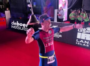 José Blas Virués celebra su hazaña tocando la campana tras completar el Ironman Lanzarote 2025