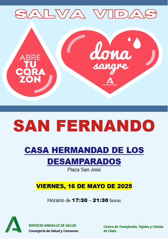 La Red Andaluza de Medicina Transfusional, Tejidos y Células de la Consejería de Salud y Familias una vez más hace un llamamiento urgente a los isleños para acudan a donar sangre y plasma con el fin de garantizar para cubrir las necesidades de los centros sanitarios de San Fernando.