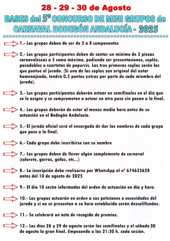 Las inscripciones ya están abiertas vía WhatsApp al número 674 633 728 y se mantendrán activas hasta el 10 de agosto. Como incentivo, el concurso ofrece premios de 450 euros para el primer lugar, 200 euros para el segundo y 100 euros para el tercero.
