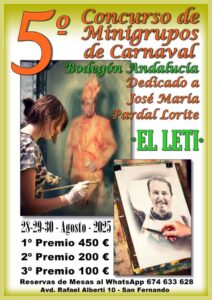 El Bodegón Andalucía ya tiene todo listo para acoger la quinta edición de su popular Concurso de Minigrupos de Carnaval, un evento que, como cada año, rinde homenaje a grandes figuras del carnaval que nos dejaron. En esta ocasión, el certamen estará dedicado a la memoria de José María Pardal Lorite, más conocido como 'Leti', recordado y querido chirigotero fallecido en enero 2018 a sus 41 años